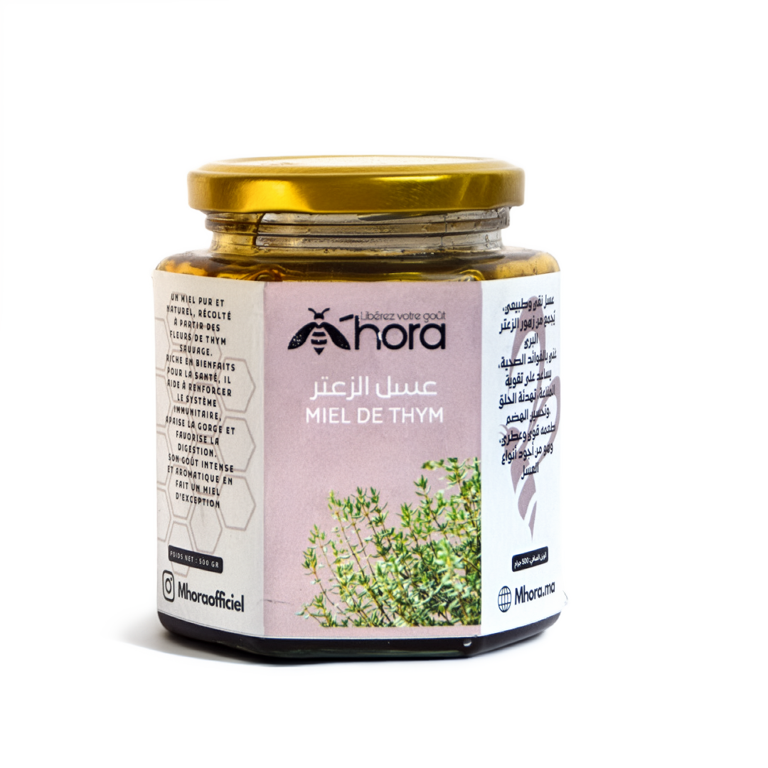 Notre miel de thym est issu d’une apiculture traditionnelle, où les abeilles butinent les fleurs de thym sauvage sous le soleil marocain.